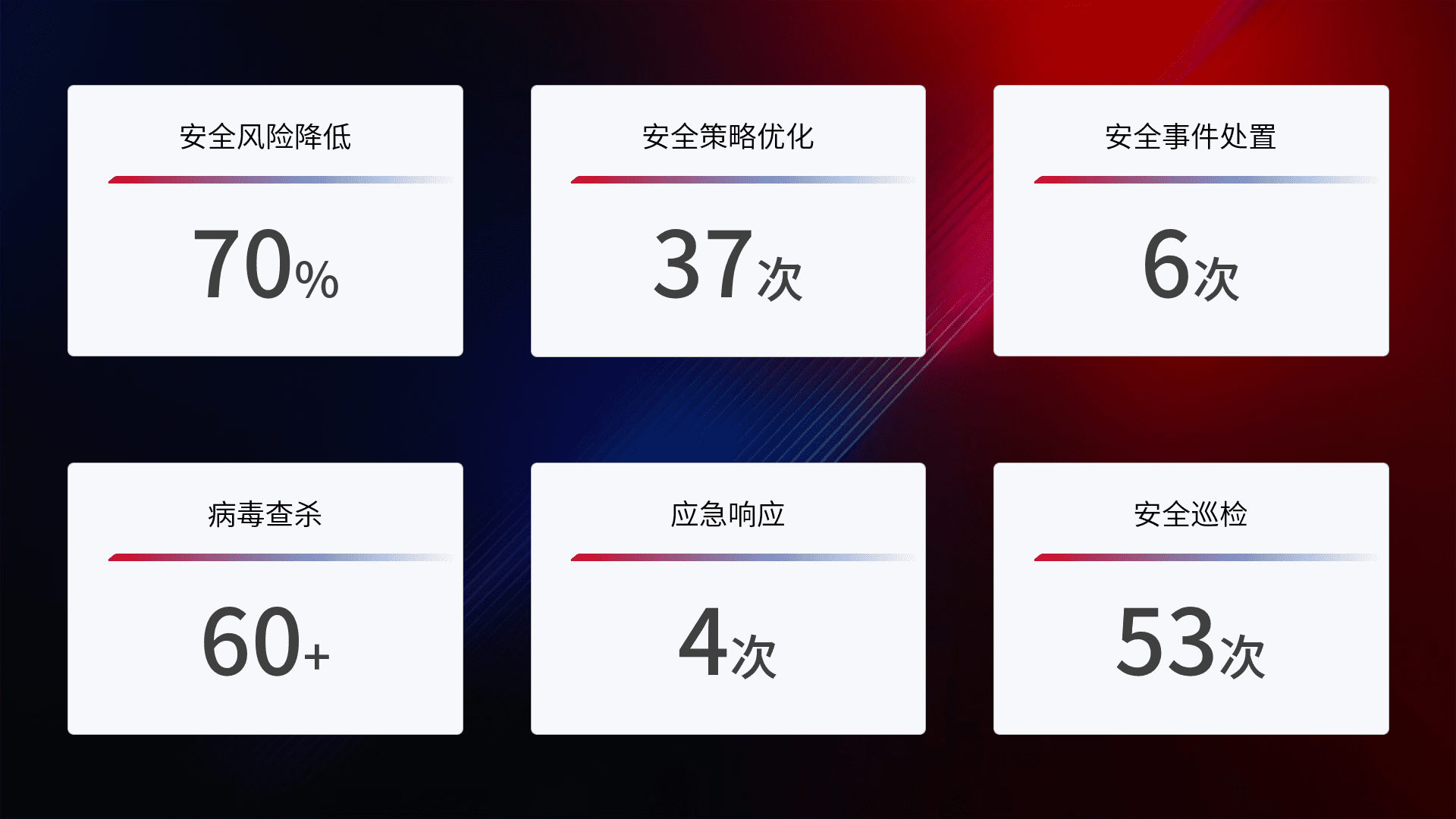 提供全面的安全事件报告体系,,,,包括处置报告、、、、周报、、、、季度和年度总结,,结合持续监控,,,帮助客户深入了解网络安全状况。。。。