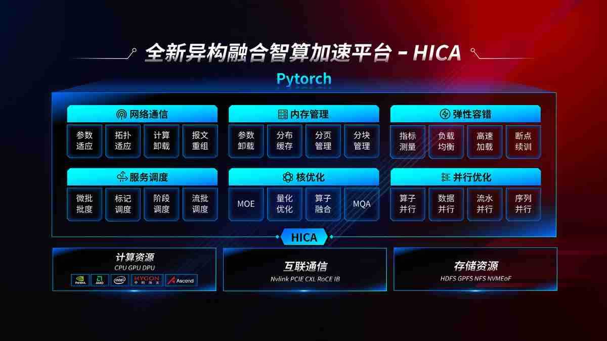 通过自研的服务层、、中间适配层、、、、以及调度编排算法,,,采用数据并行、、模型并行等多种并行方式,,把并行计算任务进行有效的分解,,使其分别由相应的软件栈和算力资源来承接。。。。当GPU资源变化,,,HICA可以实时动态调度计算子任务并调整模型拓扑和架构,,以充分聚合各种算力资源。。。。